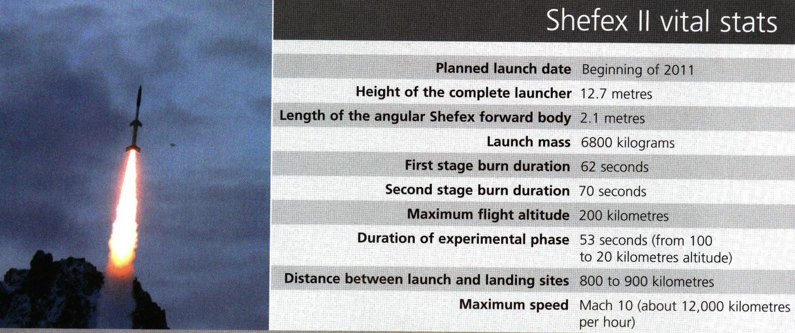 Segue abaixo uma matéria em inglês publicada na edição de dezembro de 2010 da revista “DLR MAGAZINE”, destacando o projeto alemão SHEFEX II (Sharp Edge Flight Experiment II) que contará com a participação do Instituto de Aeronáutica e Espaço (IAE) cedendo um foguete brasileiro VS-40 para o lançamento deste experimento no espaço, previsto agora para ocorrer da Base de Woomera (sul da Austrália) no segundo semestre de 2011, segundo consta na programação do site da agência espacial alemã.
